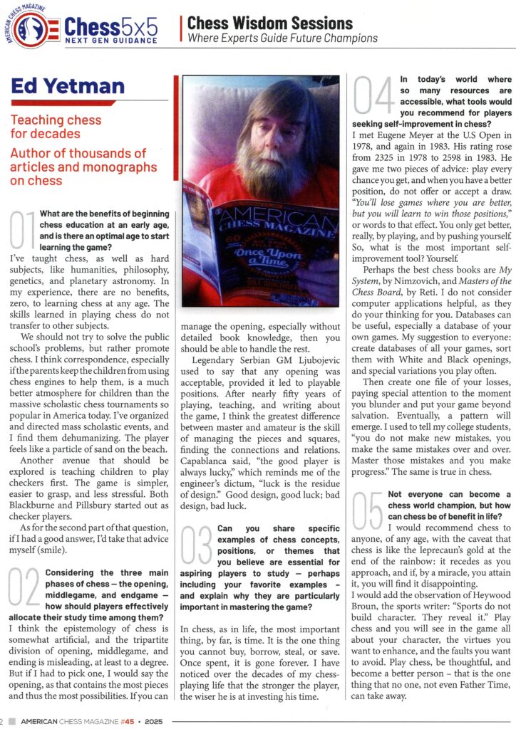 I found the information below in the Chess Wisdom Session of the American Chess Magazine [#45, 2025 page 82]. Answers from questions to Ed Yetman [BTW, I highly recommend American Chess Magazine]:
